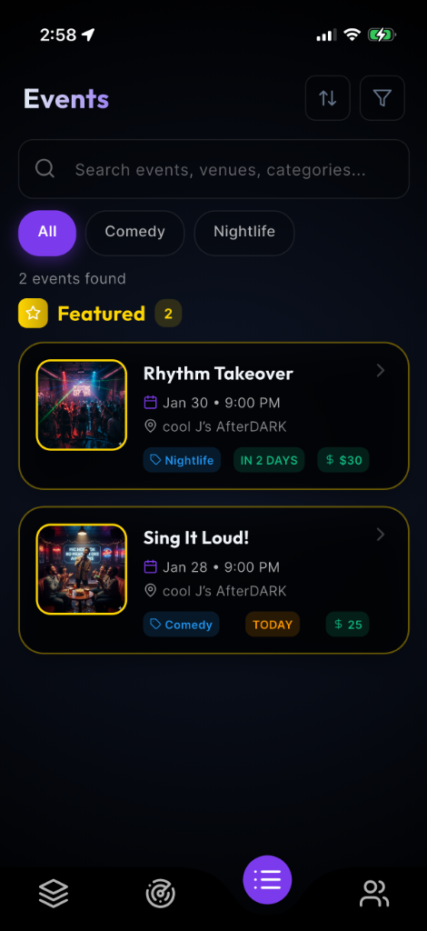 Discover events, happening now, that match your vibe. Tinder-style event browsing makes discovering your next stop effortless. No more endless scrolling, just high quality connections.